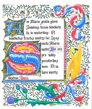 Watercolor on Bristol board with foil gilding The Illumination takes it's inspiration from several 15th Century Dutch manuscripts. Icons such as the Golden Swan and the Thistle have been worked into the design in a manor frequently found during this period to add a personal touch. The Hail Mary Prayer, which was used in Rome as early as the 7th Century, has been translated into Latin. More information regarding the history of the Hail Mary can be found here. |