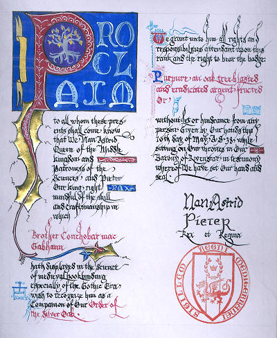 Brother Conchobar's Award of the Silver Oak Scroll was based on a 13th century English medical text book. It was done in gall ink and gouache on vellum, highlighted with 23k gold raised gilding. The scroll has little personal touches throughout including little carrots within the filigree of the "W" that measure just 4 mm high, acorns, martlets and his motto can all also be found within the illuminated elements.