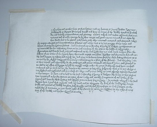 To have and to hold to the said Magistra Cassandra Elenora di Milano, she being at this present time recognized in her due station as a peer of our realm and worthy Companion of our Order of the Laurel and Arms by these Letters and assigns given to bear forevermore.