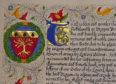 And forasmuch as Cassandra Elenora di Milano, gentlewoman, is recommended for her unstinting devotion to, and teaching of, the arts in the fields of calligraphy, illumination, and diverse book arts, and inasmuch as the said Lady has met with much acclaim from the fellows of our Order of the Laurel, have their most august majesties Alasdair and Guenievre desired me, the said Dragon, to ordain and certify her said arms to be borne henceforth by these letters Patent as is merited by her skilled works and demeanour and befitting to a Peer of the Society.