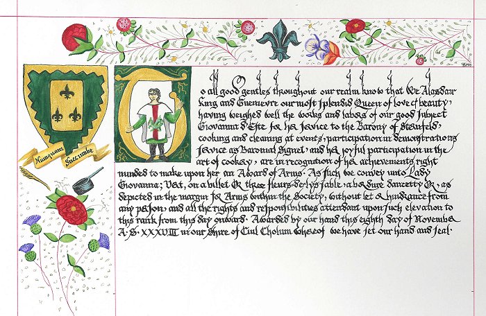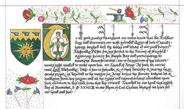 Matching AOAsI love doing heraldic art, and when I found out that this couple had registered devices it gave me the opportunity to make some beautiful award scrolls in a more historically correct style. These pieces were inspired by the 1553 Grant of Arms to Thomas Cathorne. They received quite a dramatic gasp in court when HRM unveiled the matching pieces. It did this scribe's heart good.