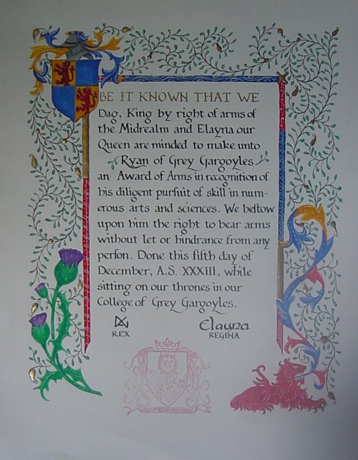 Ryan's AOABelow you'll find the illumination that I was commissioned to do by Ryan on his AoA. This is gouache and engrossing ink with 10k raised gilding on what I believe is Bristol paper.