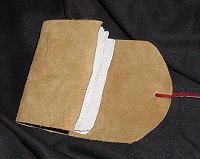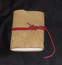 A Token Book The binding on the token books is loosely based on a find of thirteen 4th century papyrus codices in Nag Hammadi, Egypt. The majority of these books had a single quire bound in a stiff leather cover which has been strengthened by a lining of multiple layers of papyrus. In the majority of these books the upper cover extends around the manuscript creating an envelope like flap to which a wrapping band has been attached. Codices of the Nag Hammadi find were found to be bound both by using tackets which passed directly through the cover and with tackets going through a spine strip which was then covered. [1] The token book consists of a single signature of handmade paper bound in a unreinforced soft leather cover that wraps around and has a wrapping thong closure. The quire is bound directly to the cover with exposed tackets by making long stitches in a figure eight pattern through three punched holes. Our token book measures 3"x4" when closed. Paper for the prototype book was handmade by Bess, Kirk & Victoria de Nevell. Below are pictures of the project prototype.