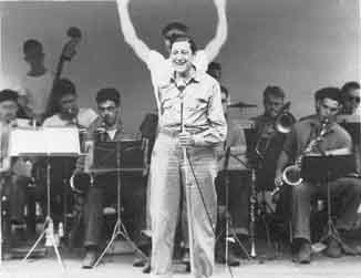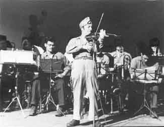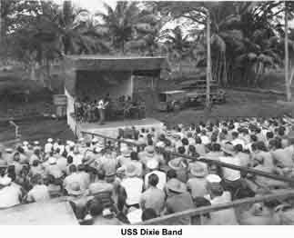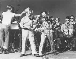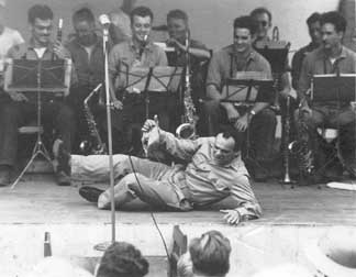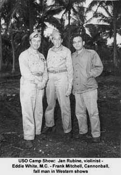 The following photos of a USO show at Camp Elrod were donated by Harrold S. Bortz. The Master of Ceremonies was Eddie White and performers included violinist Jan Rubine and fall-man Frank Mitchell. Music was provided by the